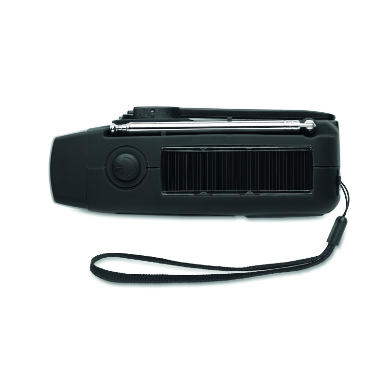 Radio AM/FM portable en ABS avec torche LED (2 réglages) et un Powerbank 1200mAh pour la recharge d'urgence. Alimentée par énergie solaire et par manivelle.