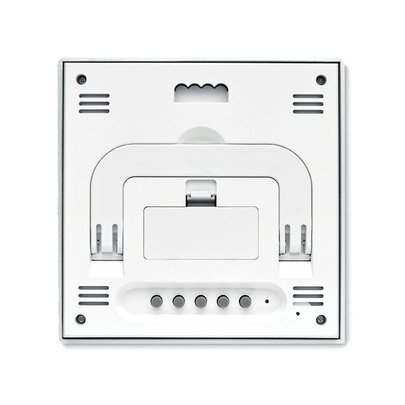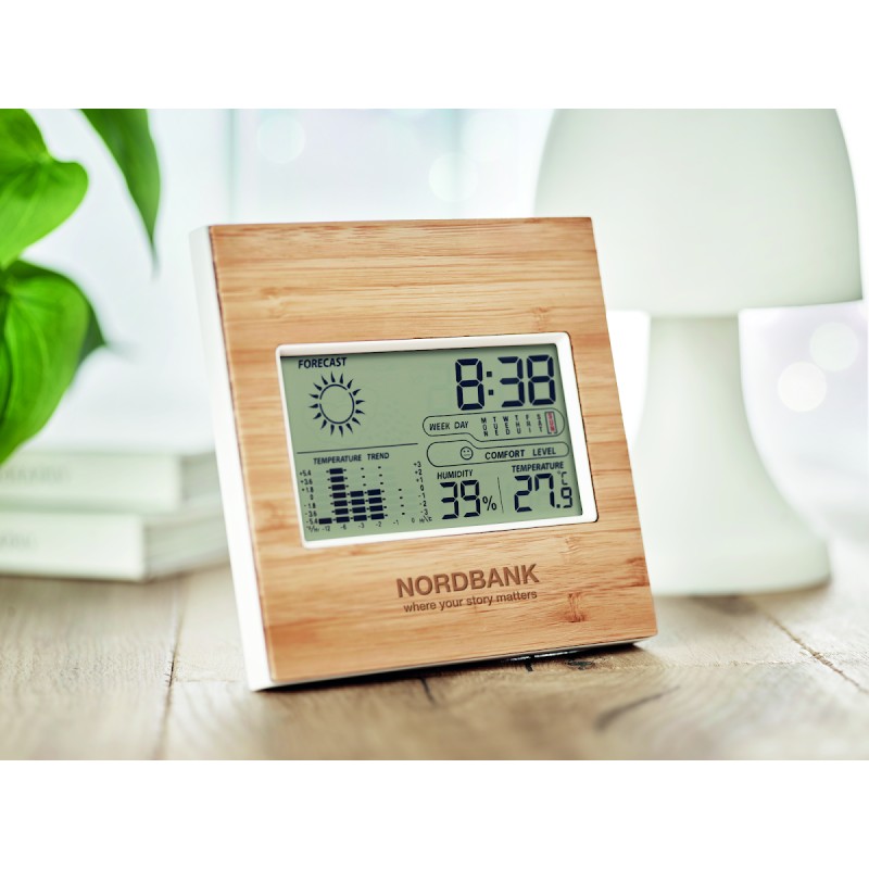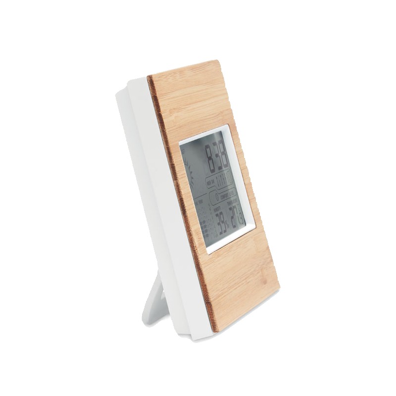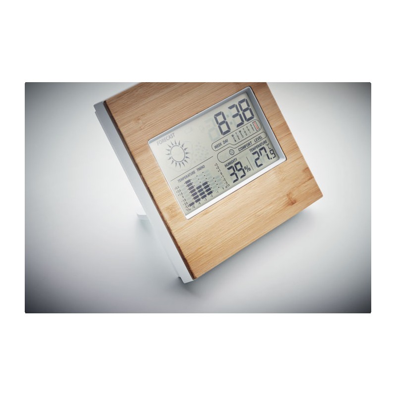 Station météo multifonction finition bambou. Comprend une horloge, un affichage de la température, de l'humidité et un calendrier. 2 piles AAA non incluses. Le bambou est un produit naturel.