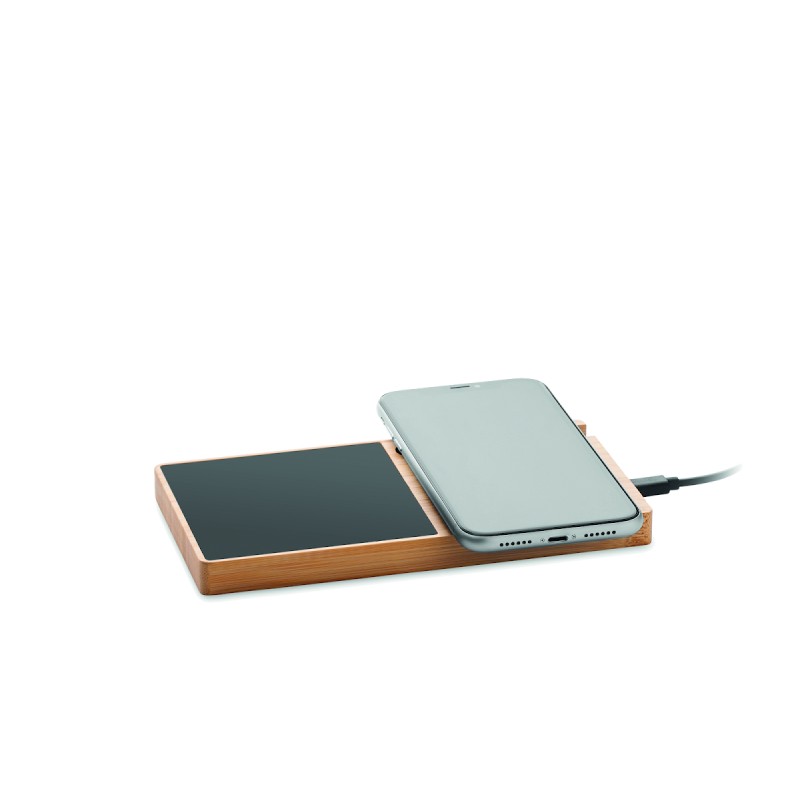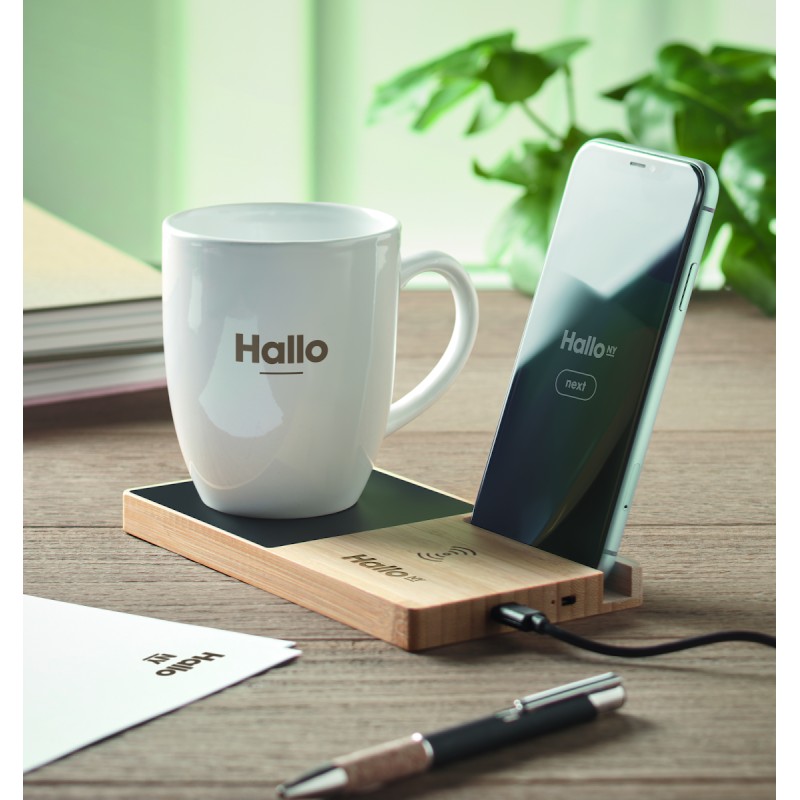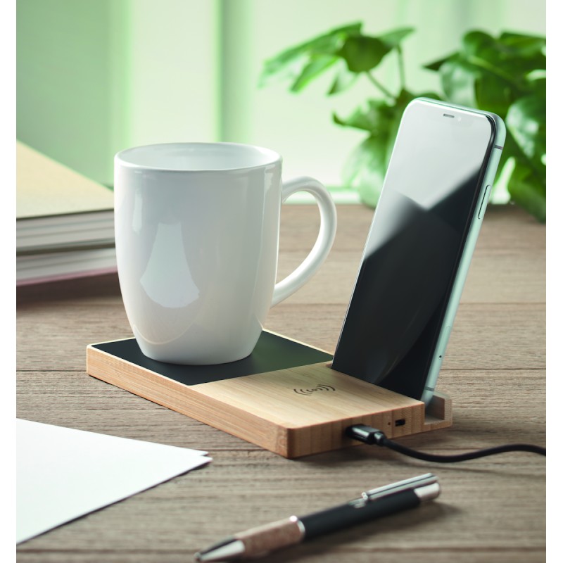 Chargeur sans fil en bambou comprenant un chauffe-tasse et un support pour téléphone. Connectez votre appareil à votre ordinateur, placez votre smartphone sur le support et laissez-le se charger. Sortie : DC 9V/1.67A (15W).
