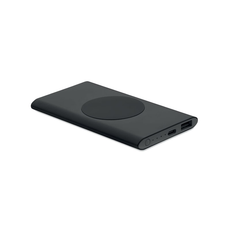 Powerbank 5000 mAh en aluminium recyclé avec recharge sans fil 15W. Entrée : Type-C. Sortie : 1 x Type-C & 1 x Type-A. Courant de sortie DC5V/2A.