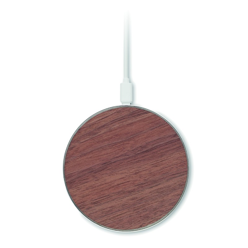 Chargeur sans fil en aluminium recyclé avec dessus en noyer. Connectez votre appareil à votre ordinateur, placez votre smartphone dessus et laissez-le se recharger. Sortie : DC 9V/1,67A (15W).