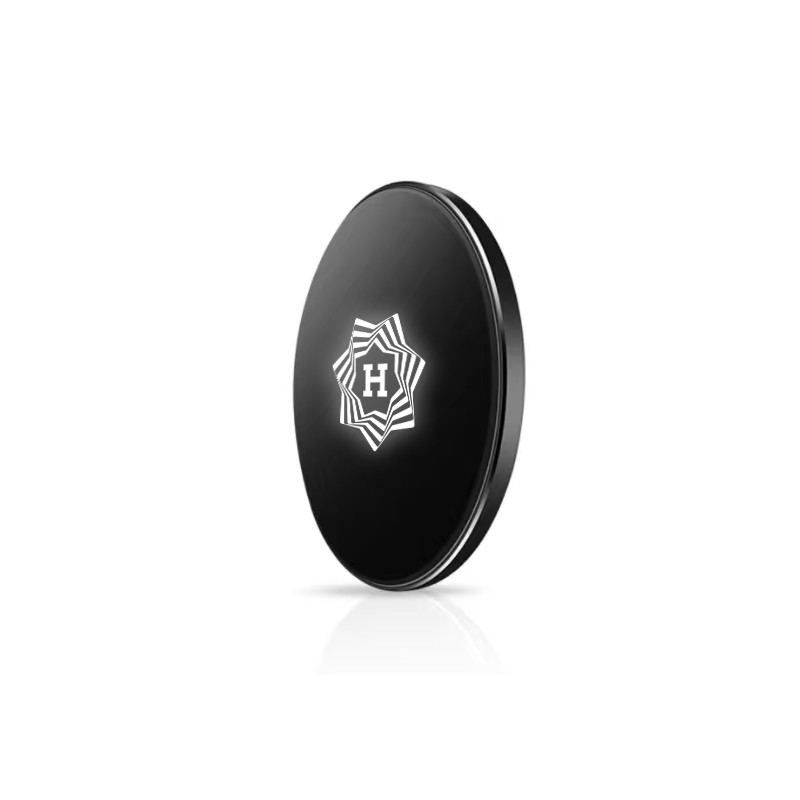 Chargeur sans fils à induction extra plat en ABS noir - Dimensions 100 x 100 x 7 mm - Poids 55 gr - Finition Led tout autour - Connecteur Micro-USB - Distance de transmission 6 mm - Input 5V 2A & 9V/2A - Boite cadeau noire et Câble USB inclus - Gravure 1 face Ø 5 cm max. - Garantie 2 ans