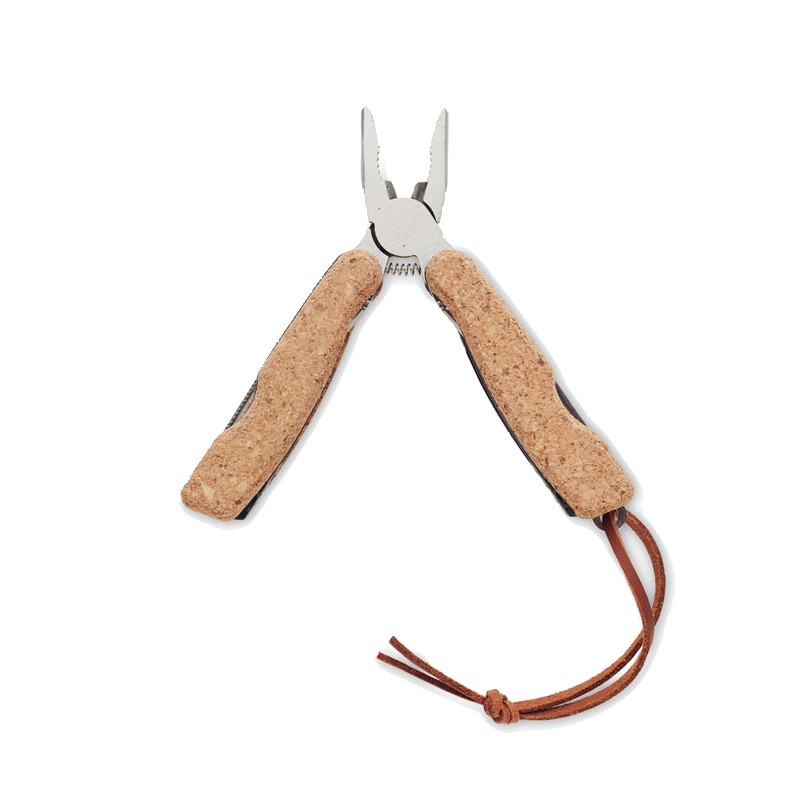Couteau de poche multifonction en acier inoxydable avec couvercle en liège et manche en PU. 9 fonctions: Pince, 2 ouvre-boîtes, tournevis avec embouts cruciforme et plat, lames de scie, couteau, lime. Le liège est un matériau 100% naturel. En raison de sa structure et de la porosité de sa surface, le résultat final de l'impression par article peut présenter des différences.