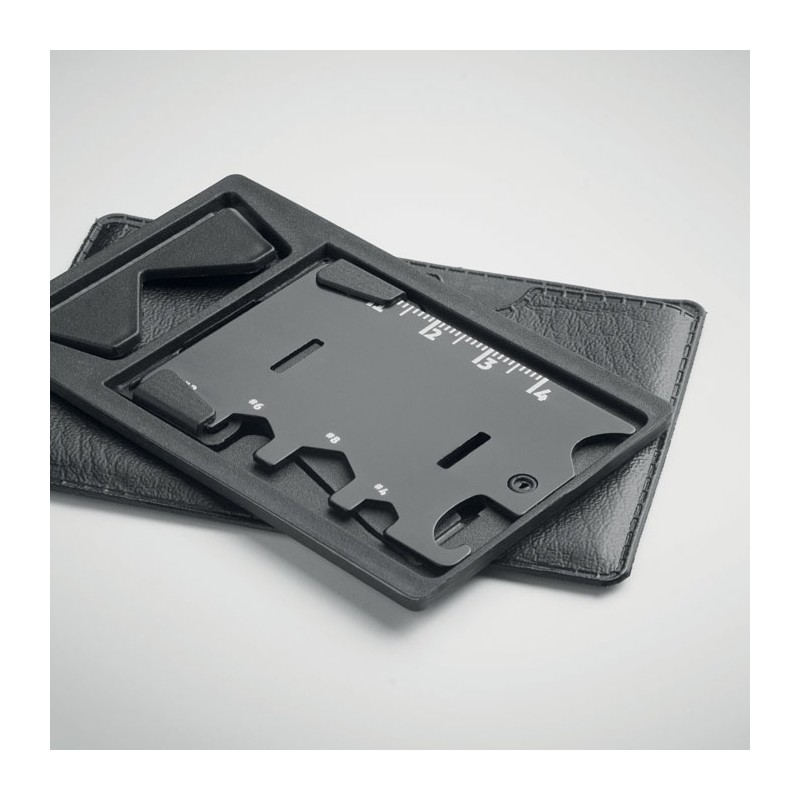 Multi-outils en acier inoxydable et PP avec support de téléphone à 6 outils dans une pochette en PU. Il comprend des tournevis, une règle, une clé hexagonale et un décapsuleur.