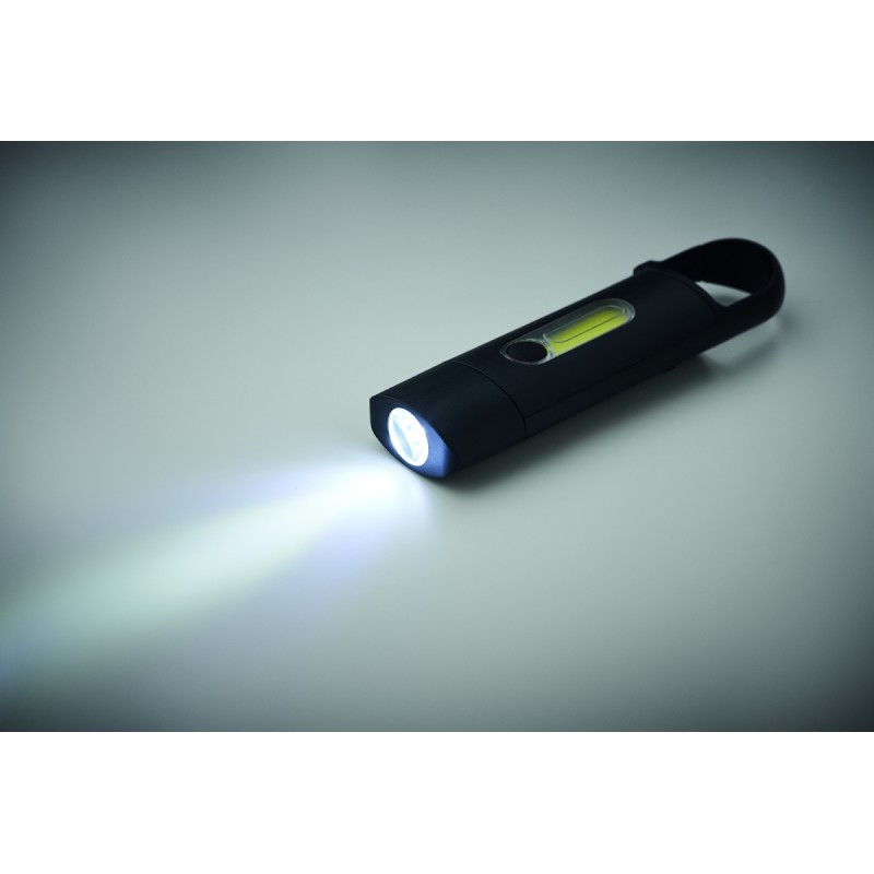 Lampe de poche COB rechargeable avec mousqueton en ABS. Lumière d'urgence et 3 modes d'éclairage. 1 pile rechargeable au lithium 3,7V, 200 mAh (incluse, non remplaçable).