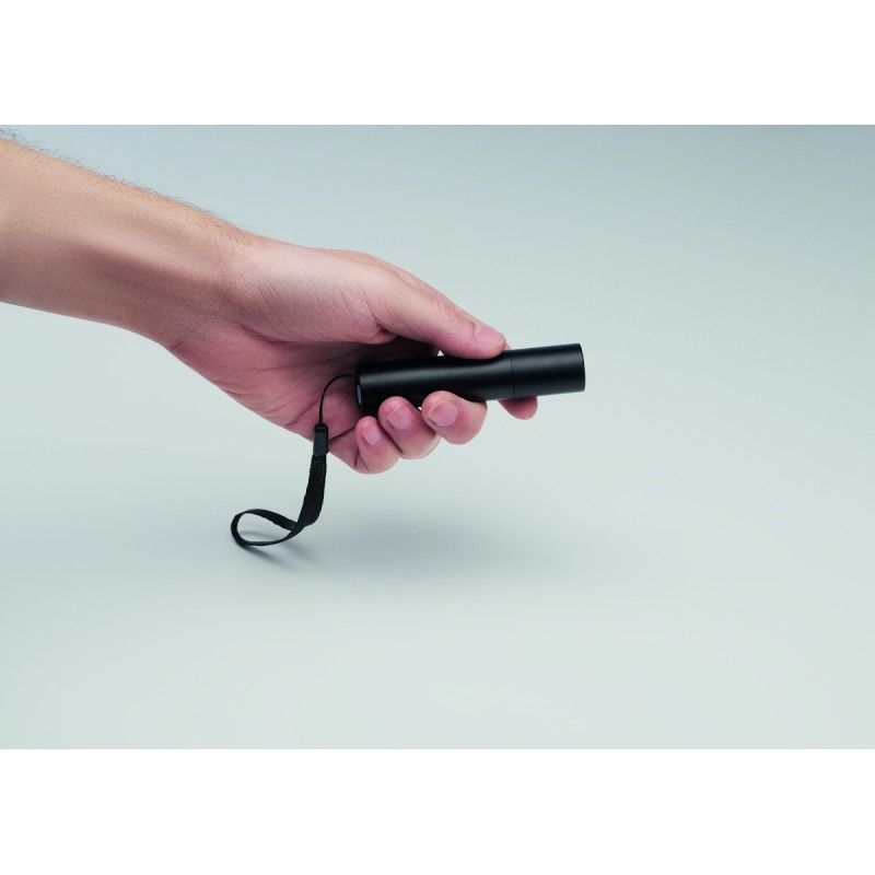 Torche rechargeable et réglable avec 1 LED (50 lumens) et 3 modes d'éclairage. Batterie rechargeable intégrée de 400 mAh et câble de chargement inclus.