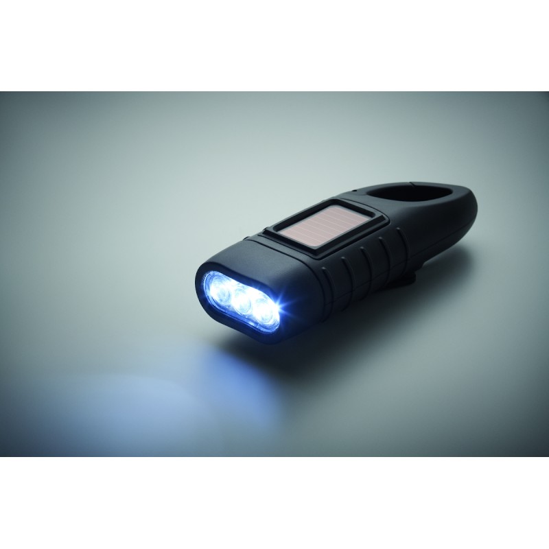 Torche à 3 LED blanches alimentée à la fois par un panneau solaire et une manivelle dynamo avec une batterie de 40 mAh en ABS recyclé.