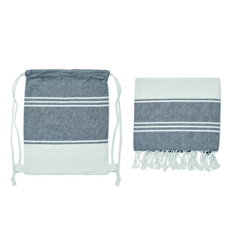 Fouta avec sac à cordon assorti. 70% coton recyclé et 30% polyester recyclé 180 gr/m². Fouta 90x160 cm.