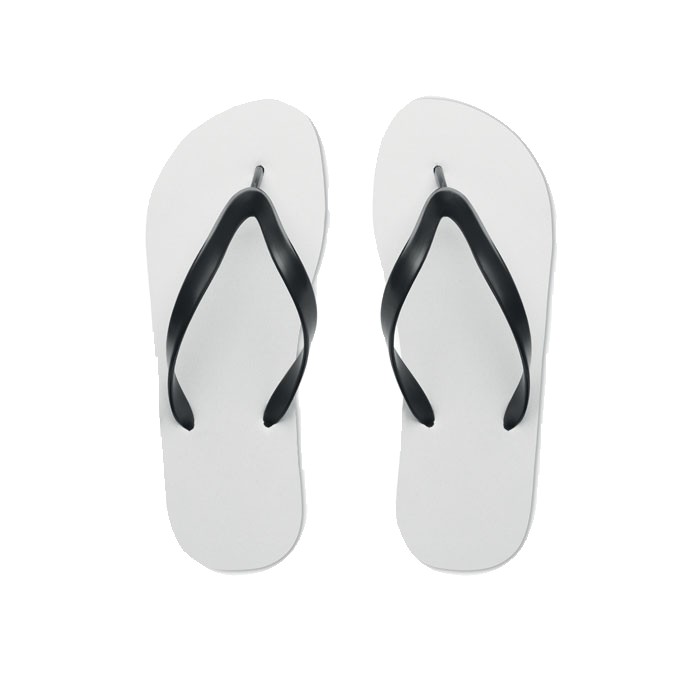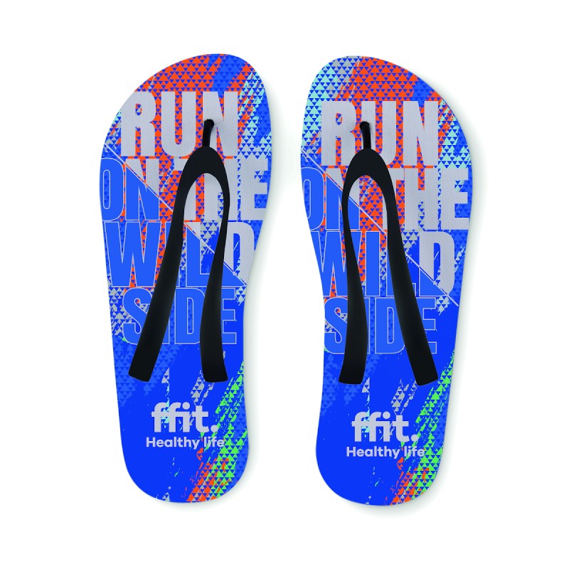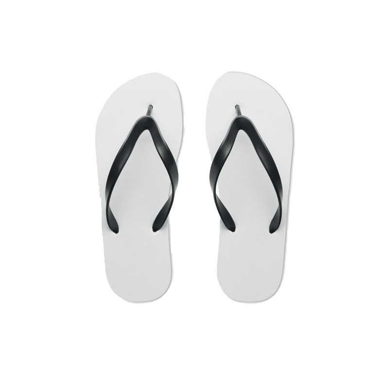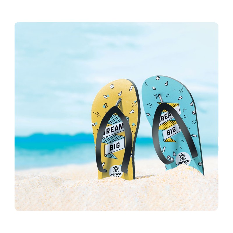 Tongs pour sublimation avec sangles en PVC. Semelle en caoutchouc et tissu en polyester sur le dessus. Taille 42-44. L'article ne peut être commandé qu'en version imprimée.