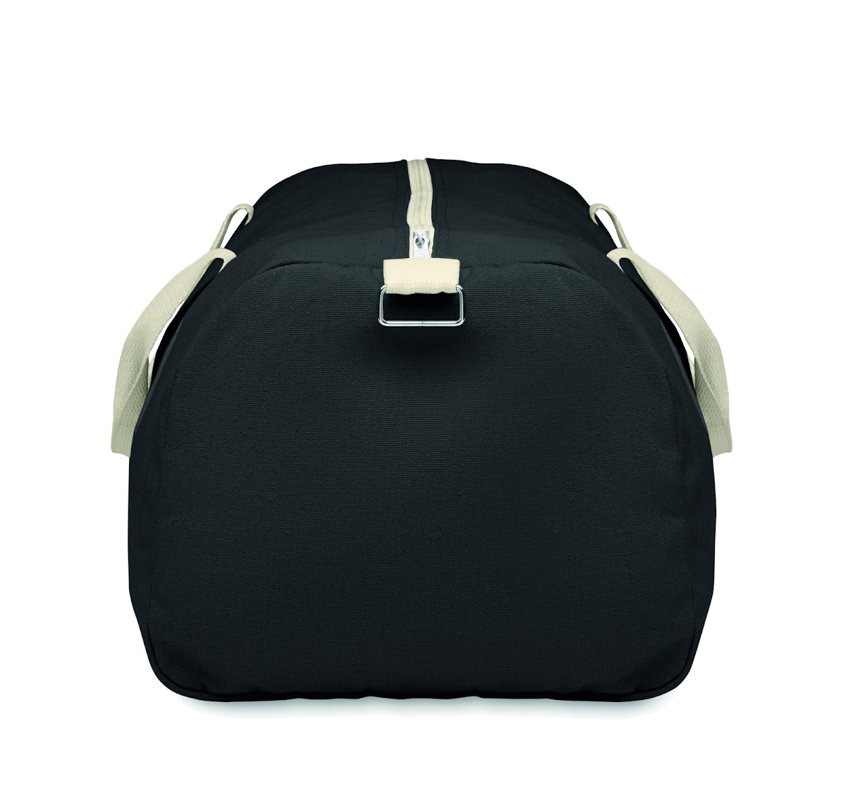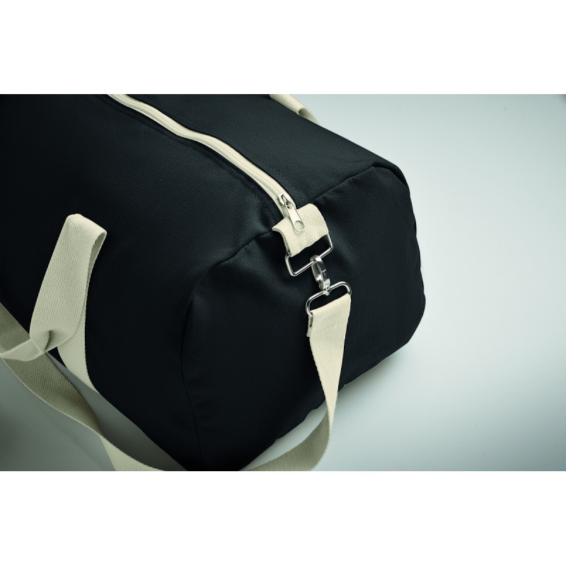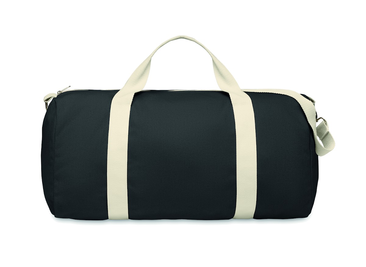 Sac de sport en tissus recyclés (60% coton recyclé, 40% polyester recyclé) en 320 gr/m² avec poignée en sangle de coton naturel et une bandoulière réglable et amovible.