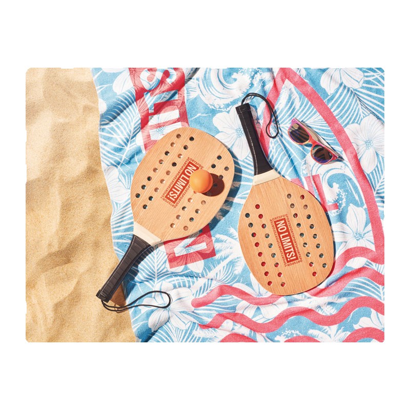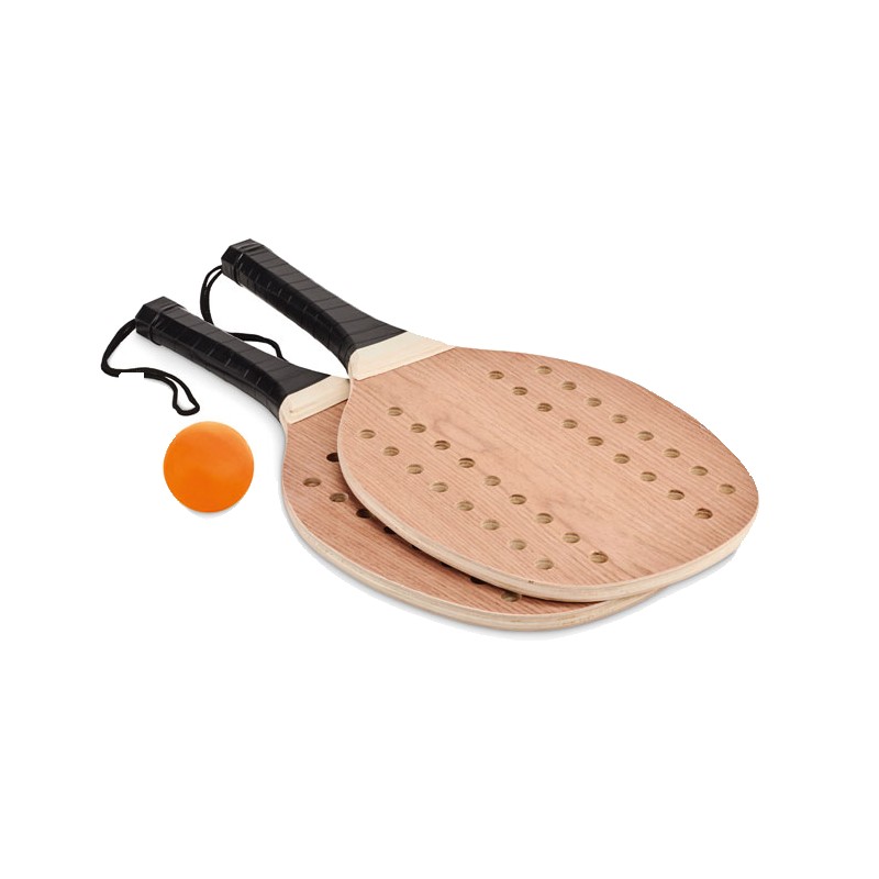 Set de beach tennis composé de 2 raquettes en bois de rose avec grip en PU et d'une balle souple. Présenté dans une pochette en coton. FSC®-certified | FSC 100%, N5.7, FSC-C213206