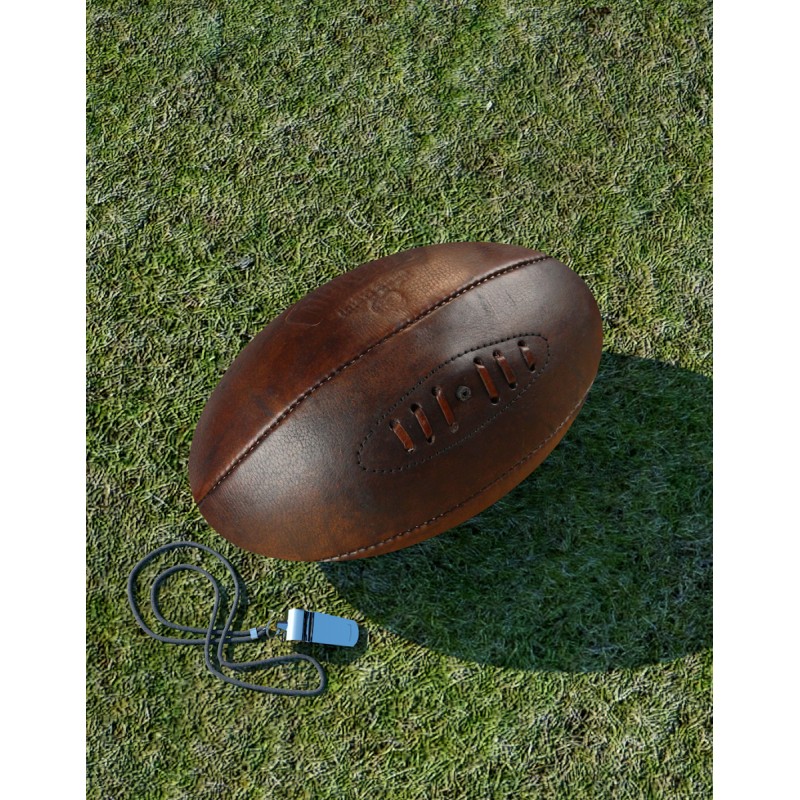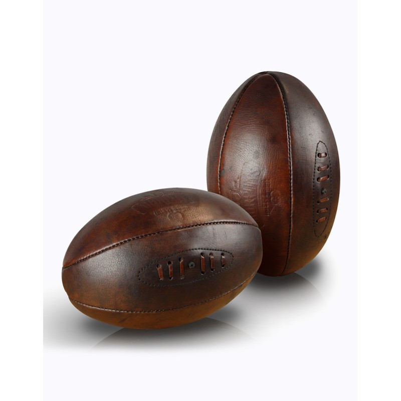Ballon de rugby en cuir véritable brun patiné à la main pour un effet Old School. Taille 5 officielle. Poids : 350g. Cousu main 4 ou 6 panneaux. Vessie latex. Personnalisation par embossage. Ballon livré non gonflé sous polybag individuel. Aiguille en option. Minimum de commande : 20 pcs