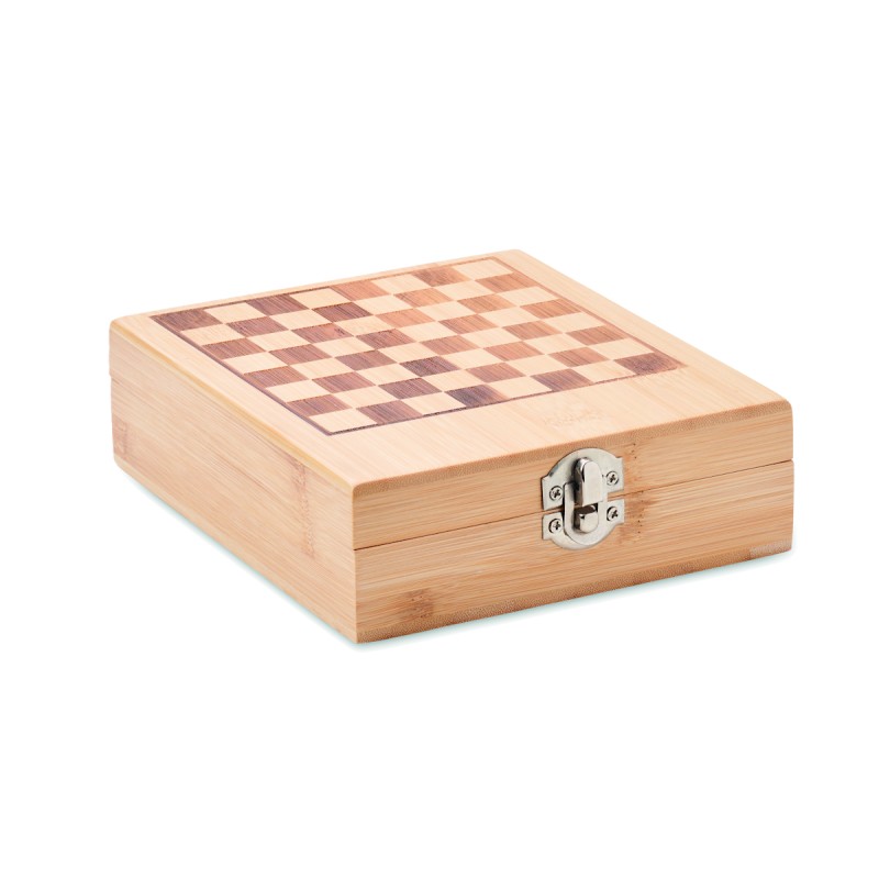 Set à vin dans une boîte en bambou avec jeu d'échecs. Comprend un tire-bouchon, un verseur de vin, un bouchon et un anneau d'égouttage pour bouteille de vin.