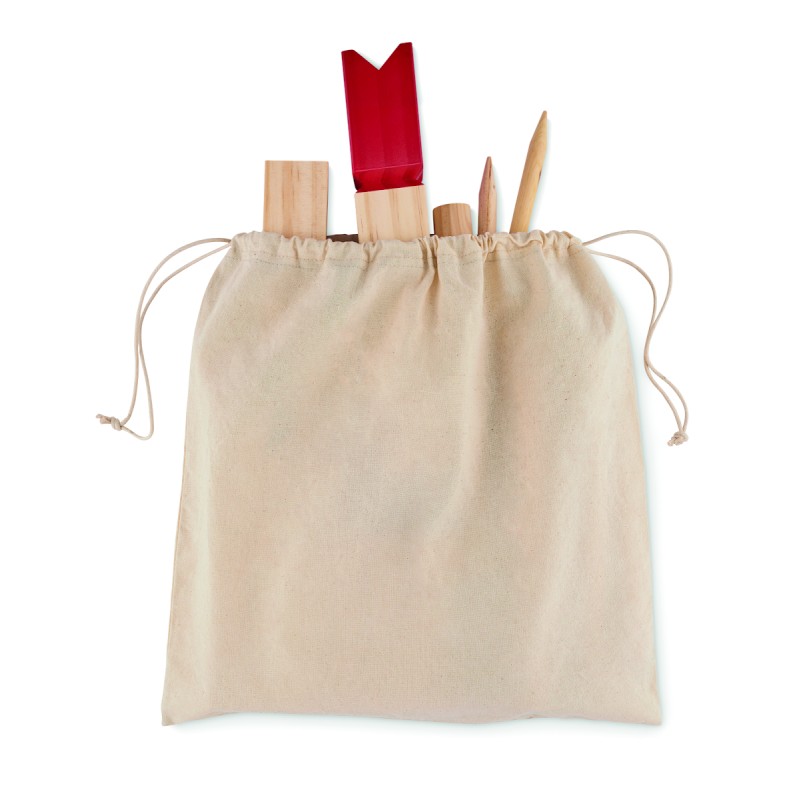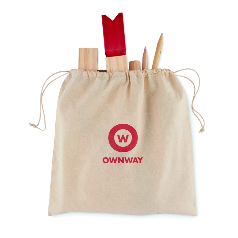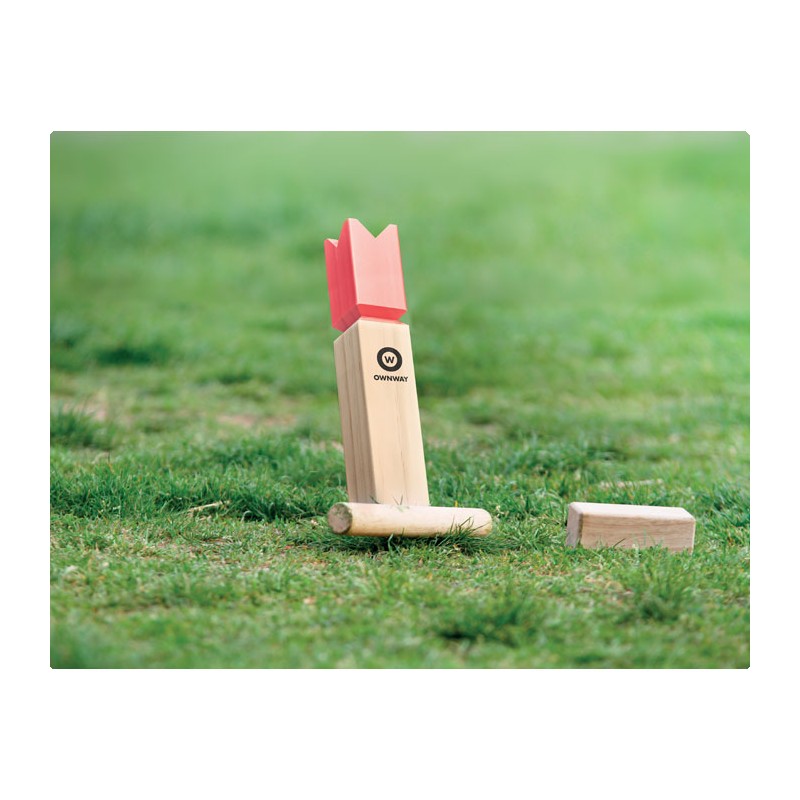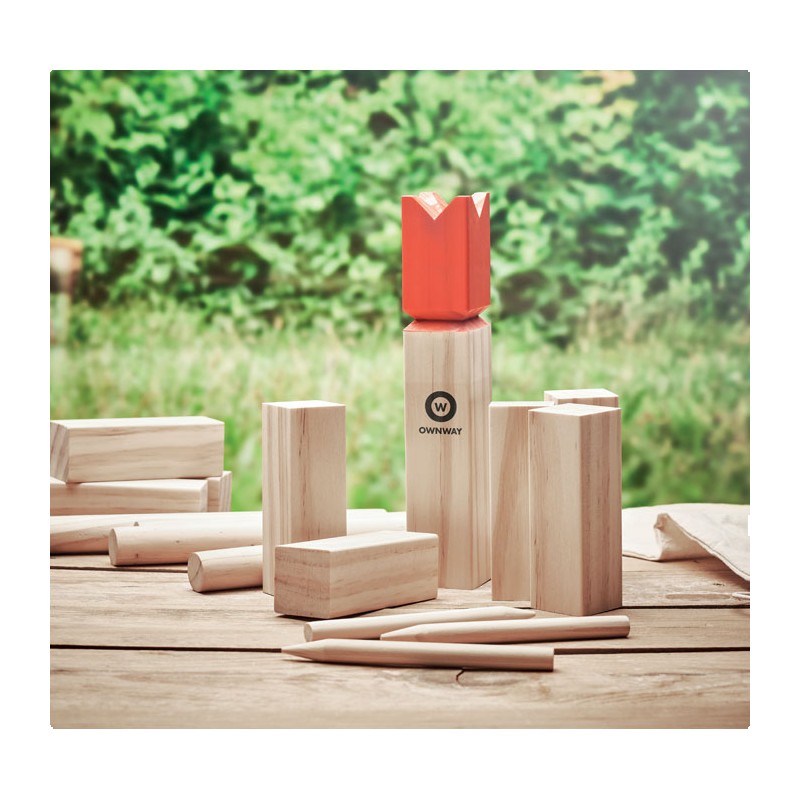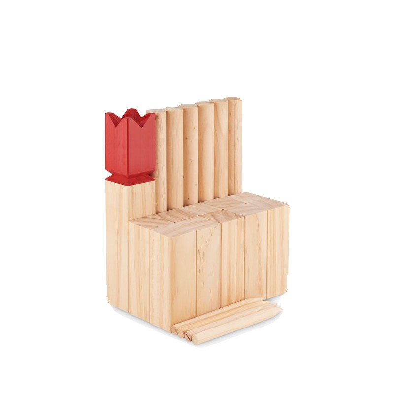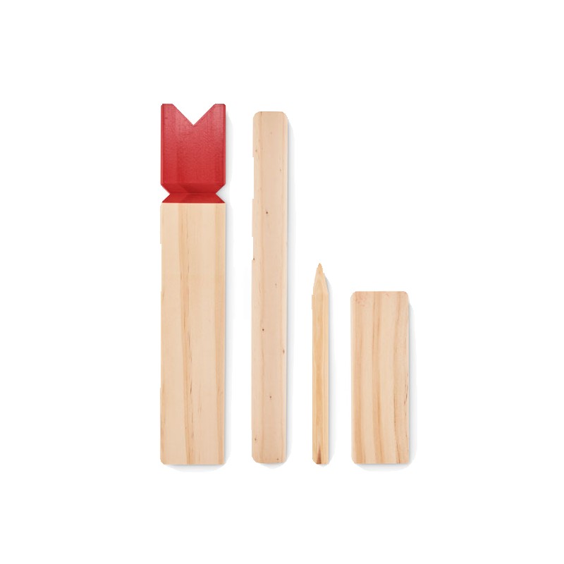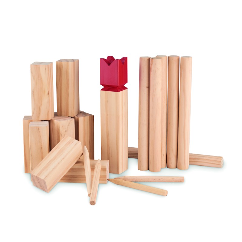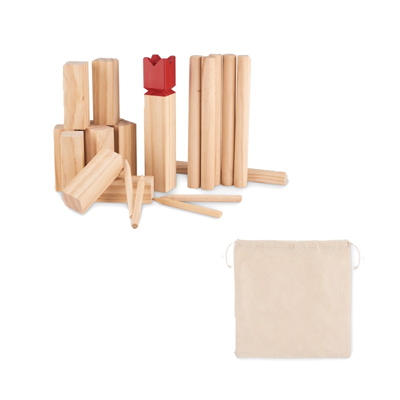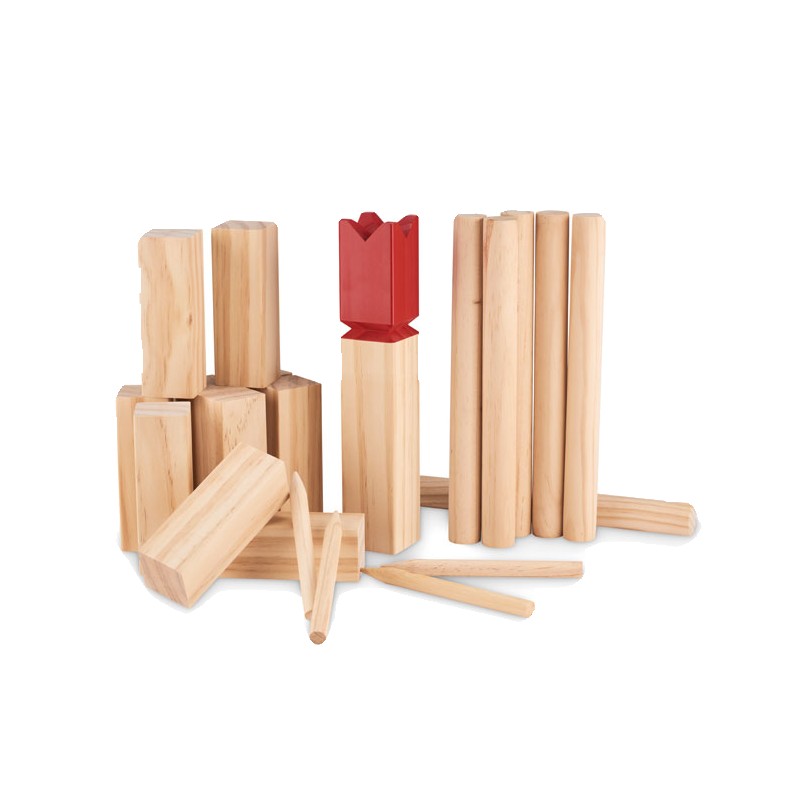 Jeu de lancer de bois de pin présenté dans un sac en coton à cordon. Ce jeu, d'origine suédoise et scandinave, est amusant pour les enfants, les familles ou un groupe d'amis et se joue généralement en plein air. Le but est de renverser les plus grands bâtons de bois en leur lançant les plus petits. La pièce centrale, le roi, sera renversée en dernier. Le premier qui les renverse tous avant son adversaire gagne. Comprend 10 bâtons carrés courts, 4 bâtons pointus, 6 bâtons ronds et 1 bâton de roi.