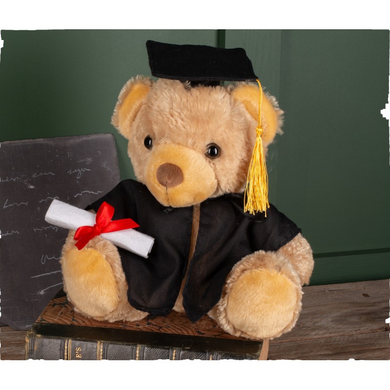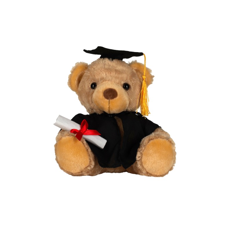 Ours portant une toque amovible et une toge. Conforme à la norme EN71. Ne convient pas aux enfants de moins de 36 mois.