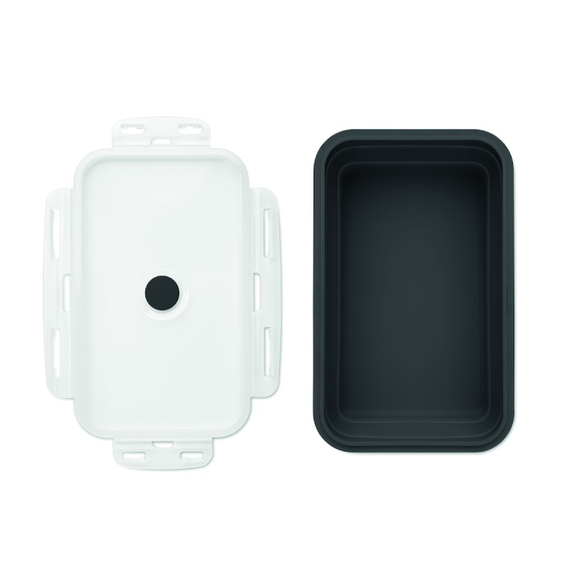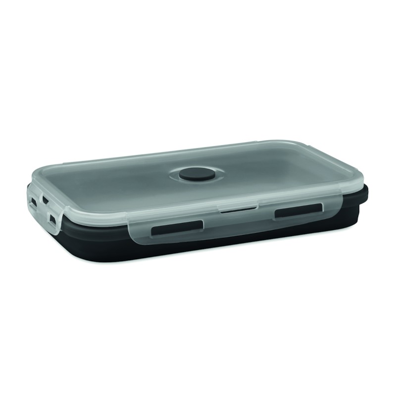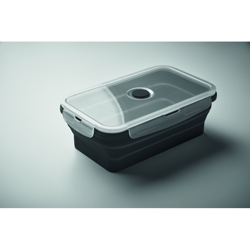 Boîte à lunch en silicone pliable avec couvercle en PP et valve en silicone. Capacité : 1200 ml.
