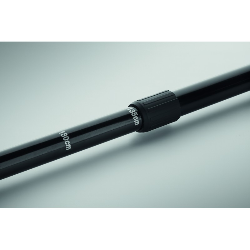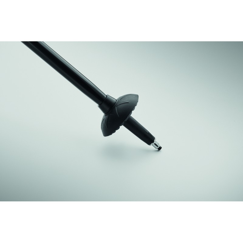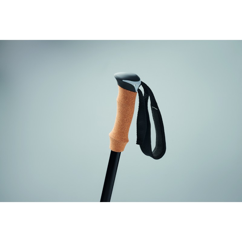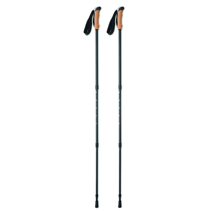 2 Bâtons de marche nordique entièrement réglables en aluminium avec poignées en liège, pointes en caoutchouc pour la marche et pare boue. Présentés dans une pochette RPET ripstop. Entièrement réglable : 65cm à 135cm.