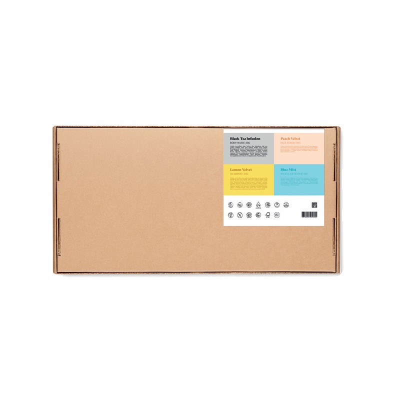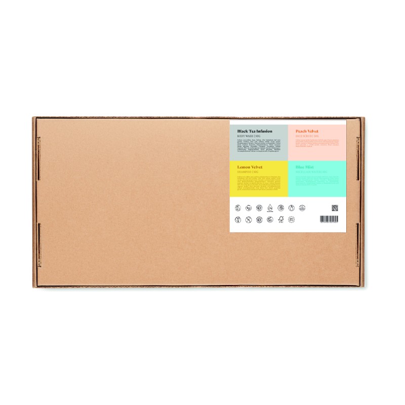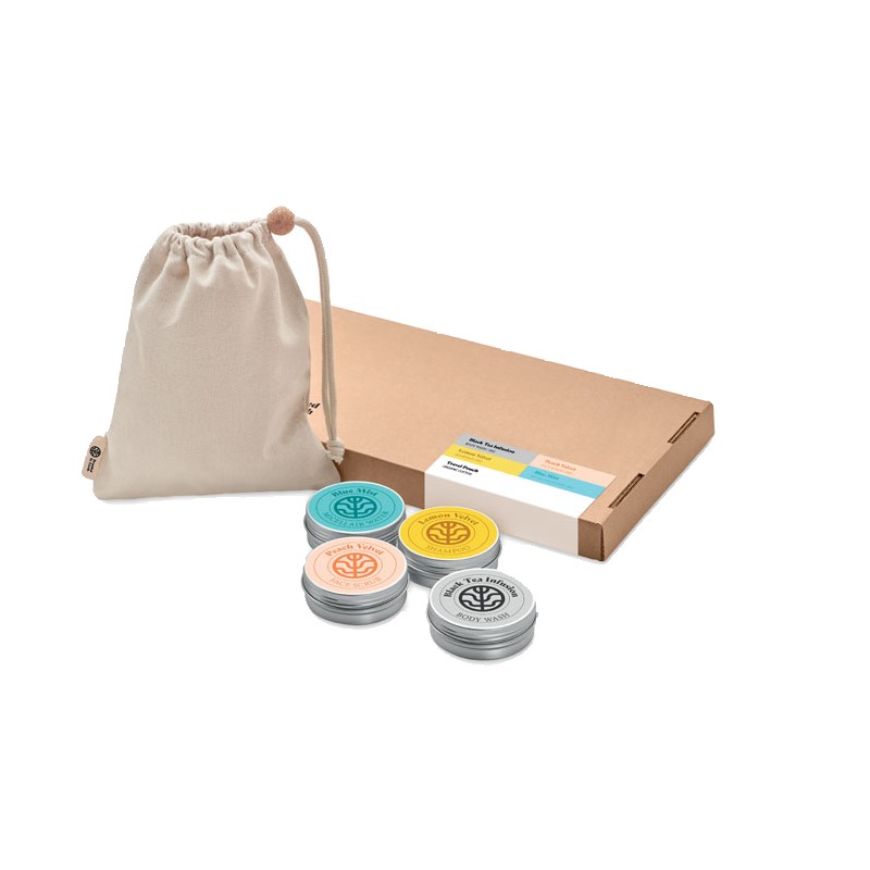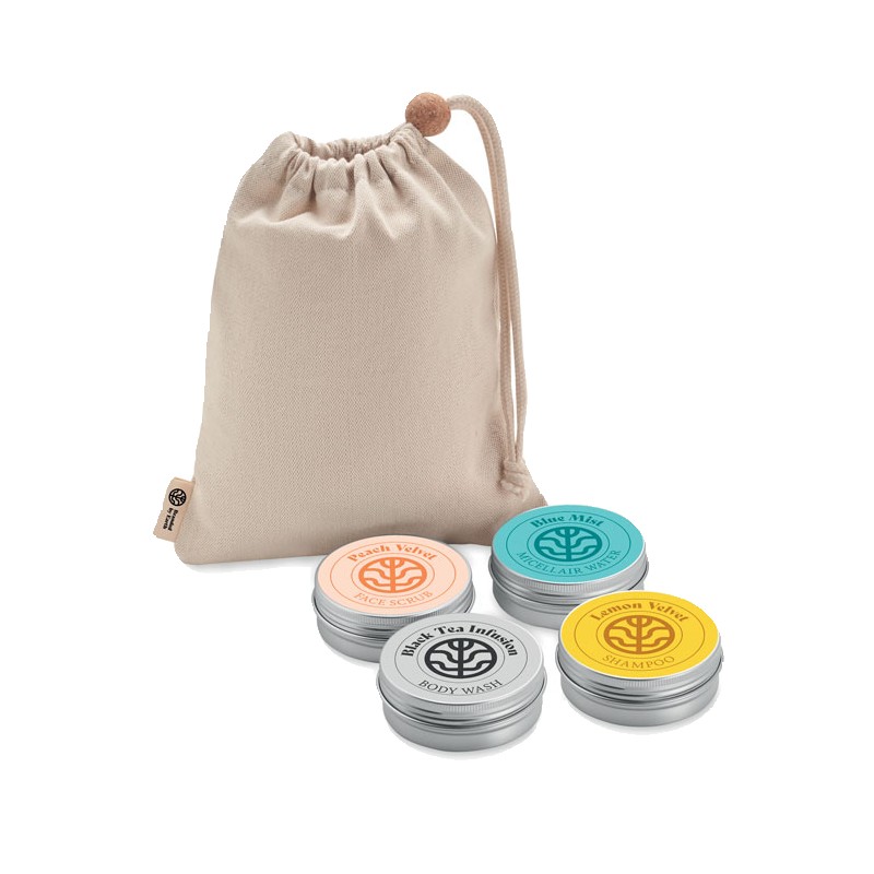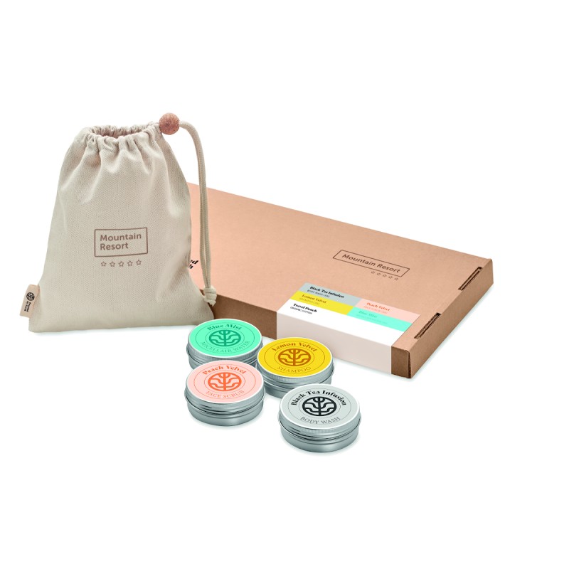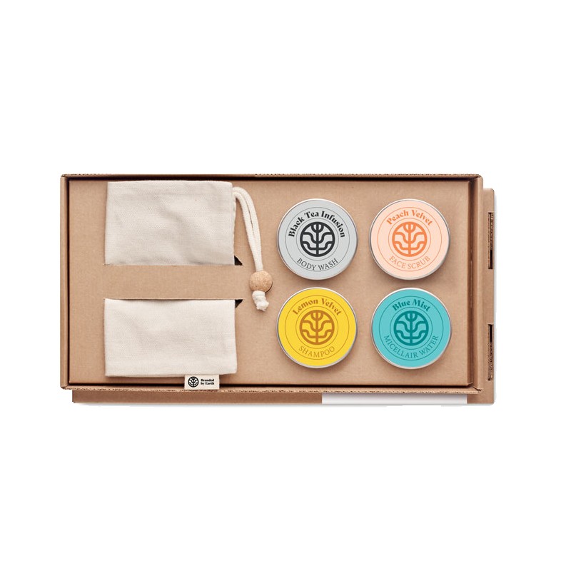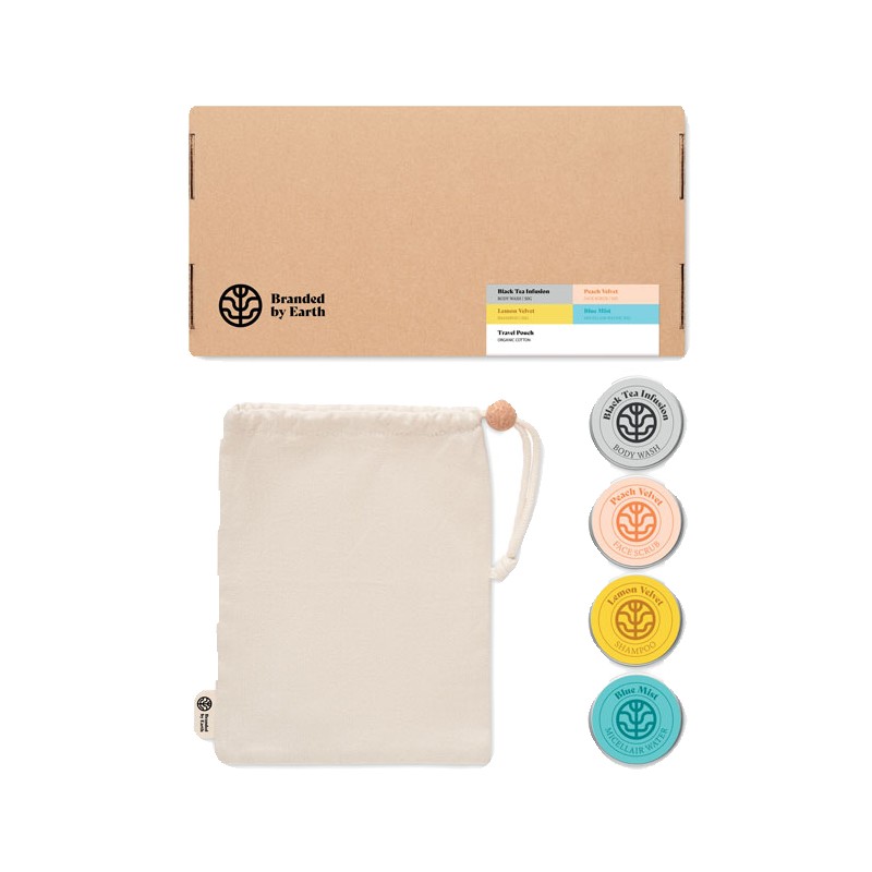 Set de voyage Branded By Earth. Comprend 50gr de gel douche vegan, un shampoing, un gommage pour le visage, une barre d'eau micellaire et une pochette en coton biologique. Emballage en papier. Boîte en papier recyclé. Fabriqué dans l'UE.