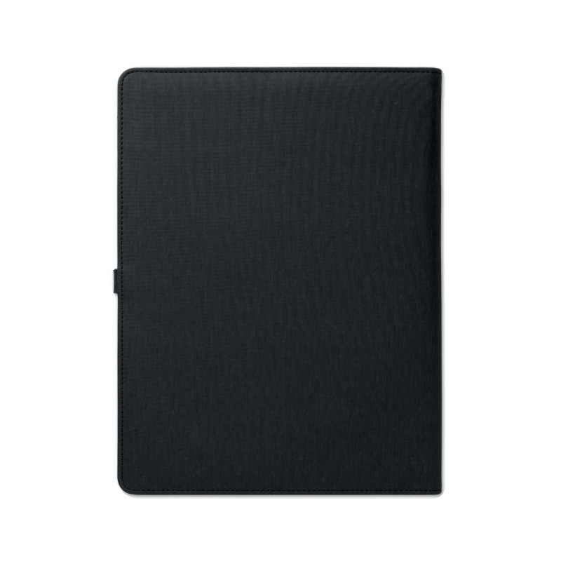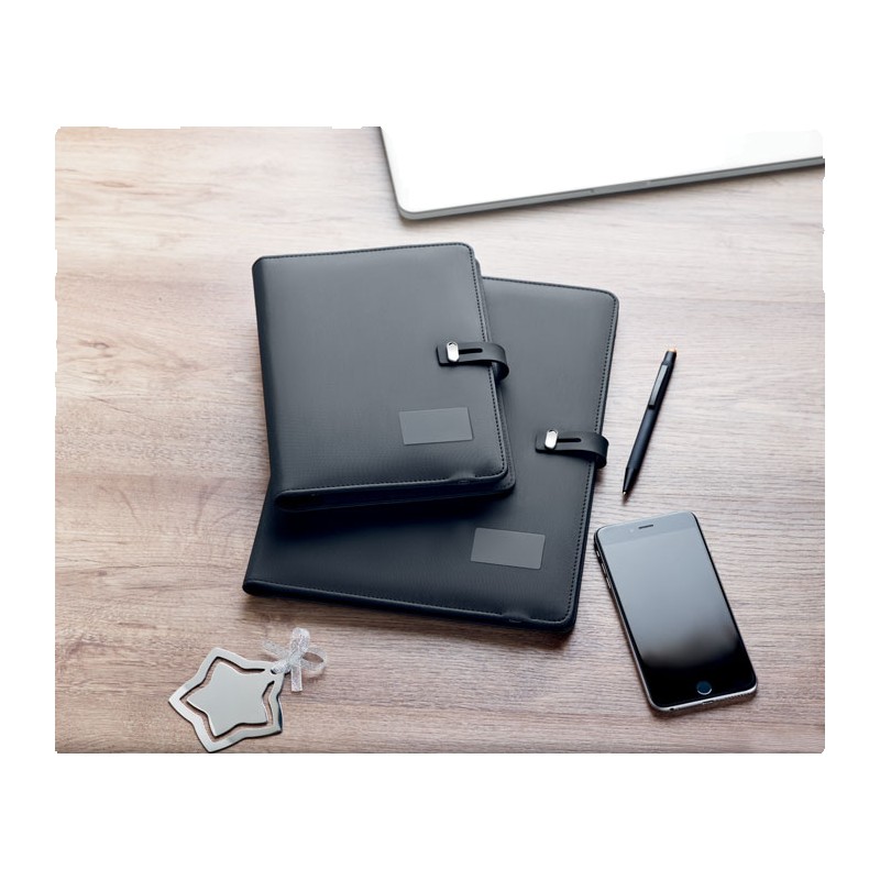 Porte-documents A4 en lin-PU avec fermoir. Chargement sans fil DC5V/1A. Powerbank de 4000 mAh avec un connecteur micro USB vers type C. Bloc-notes de 20 feuilles lignées. Porte-cartes. Porte-stylo. Plaque en aluminium noir idéale pour votre logo.