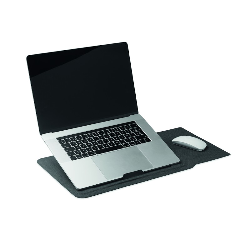 Pochette pour ordinateur portable RPET de 16 pouces avec support pour ordinateur portable et fonctionnalité de tapis de souris lorsqu'elle est dépliée.