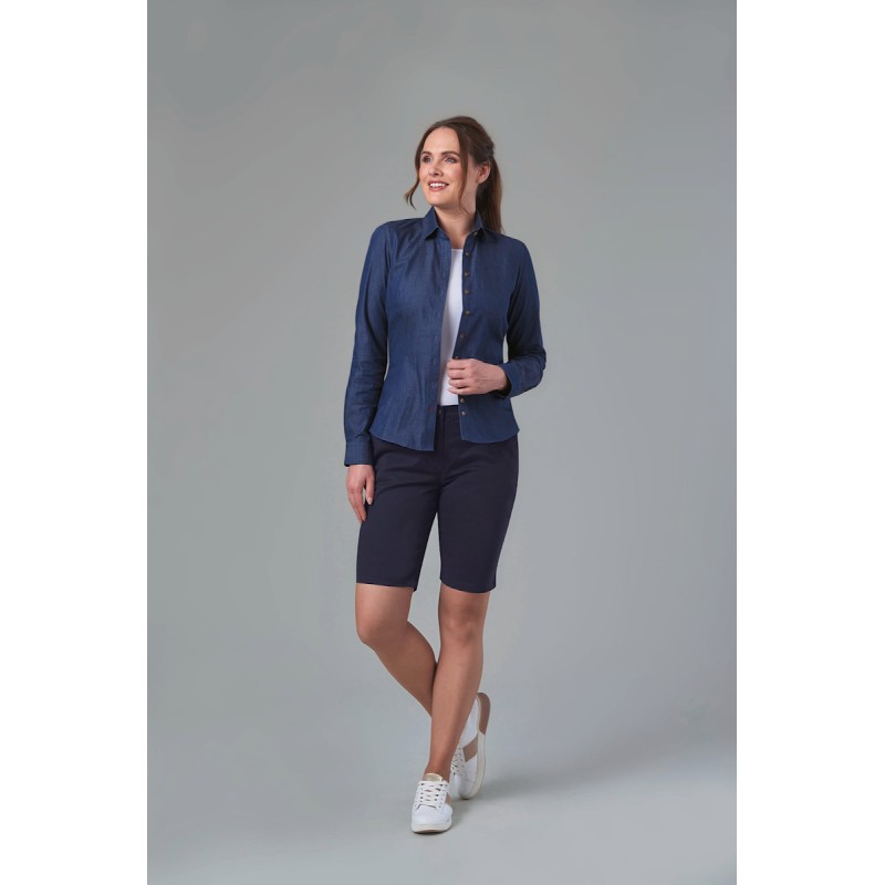 100% coton. Coupe ajustée femme, manches longues. Lavable en machine. Repassage facile. Bouton imitation corne. Lavable en machine.
