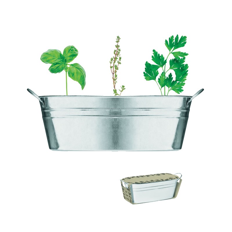 Bac à plantes en zinc avec une sélection de 3 herbes aromatiques. Graines de basilic, de thym et de persil, et compost de jardin. Fabriqué dans l'UE.