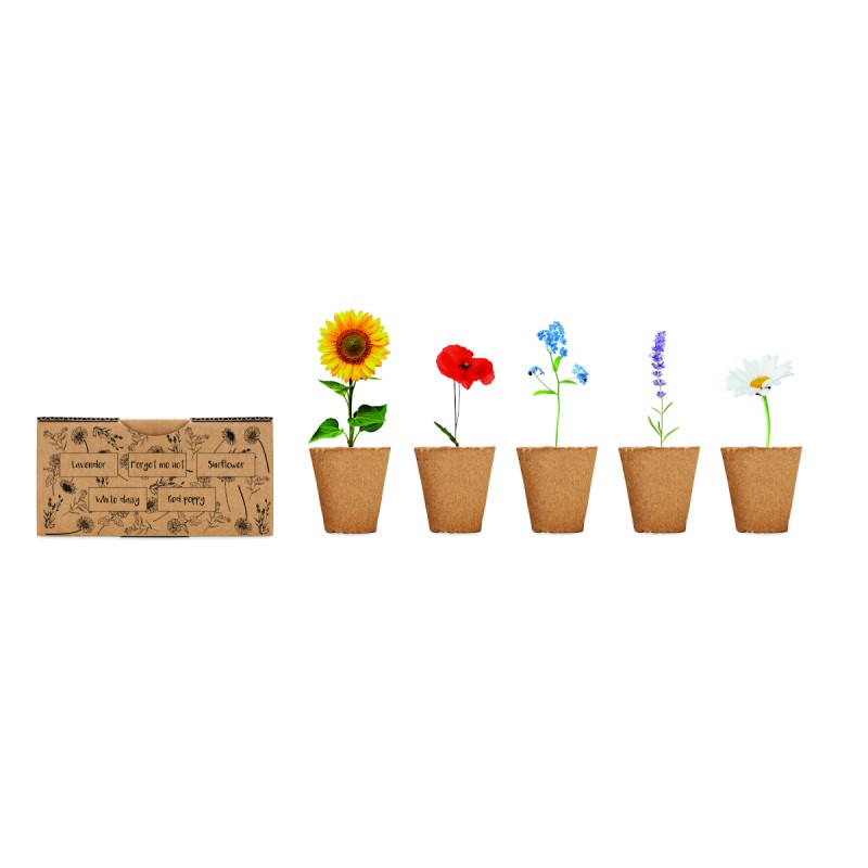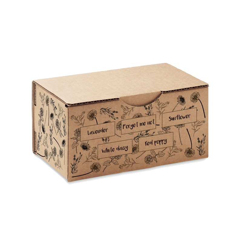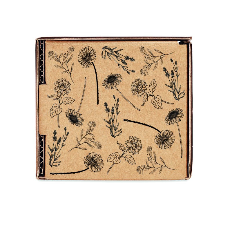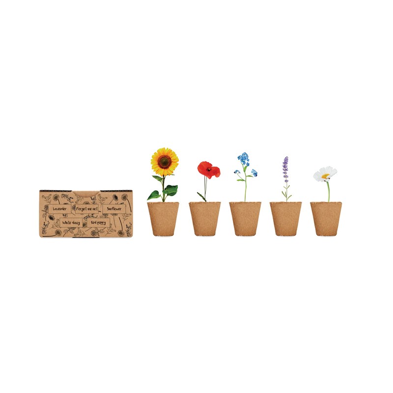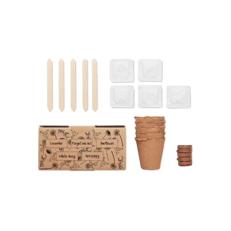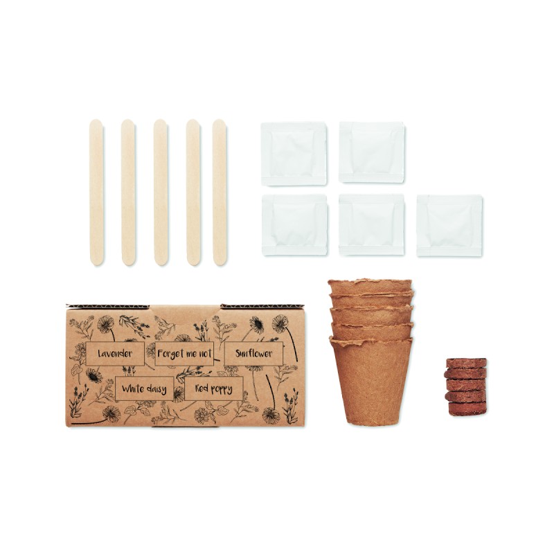 Kit de culture de fleurs. Boîte contenant des graines de lavande, de myosotis, de tournesol (Helianthus debilis), de marguerite blanche et de coquelicot. Fabriqué dans l'UE. Tablette de terreau incluse.