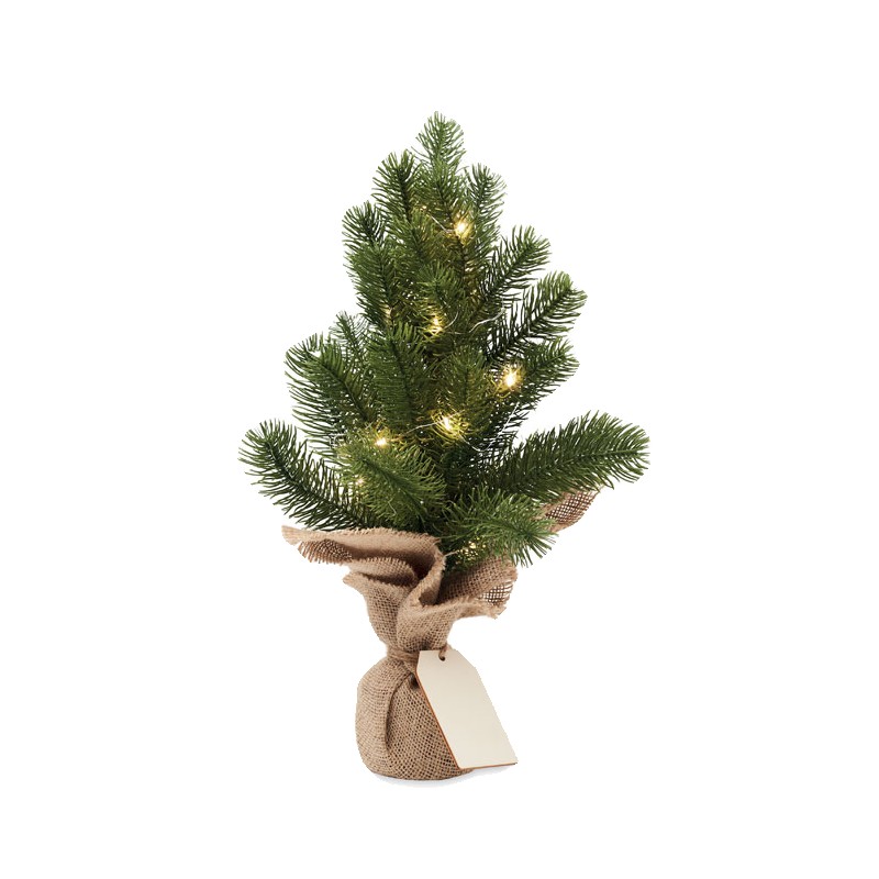Mini sapin de Noël artificiel (PE) avec guirlande lumineuse jaune chaud de 20 LED sur une base en jute. Livré avec une étiquette cadeau en bois. 2 piles AA non incluses.