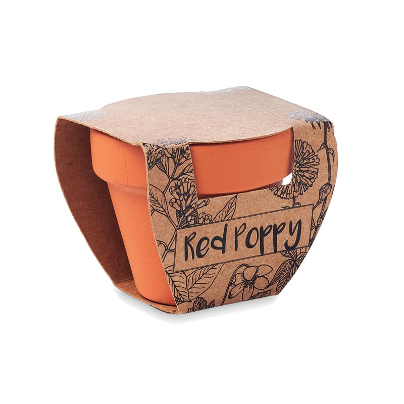 Petit pot en terre cuite contenant des graines de coquelicot. Fabriqué en UE. Tablette de terreau incluse.
