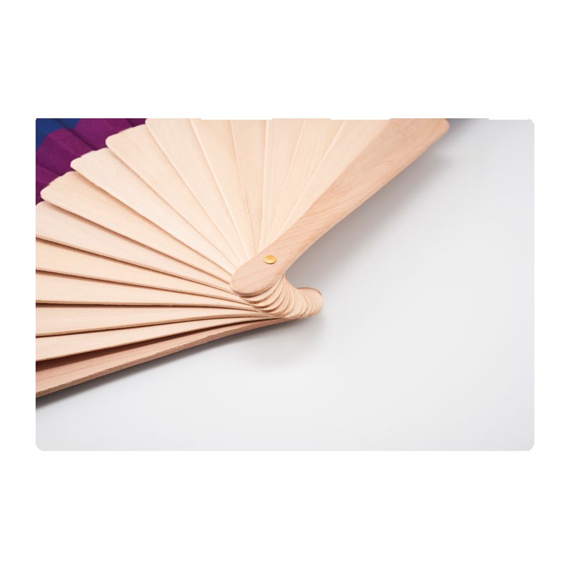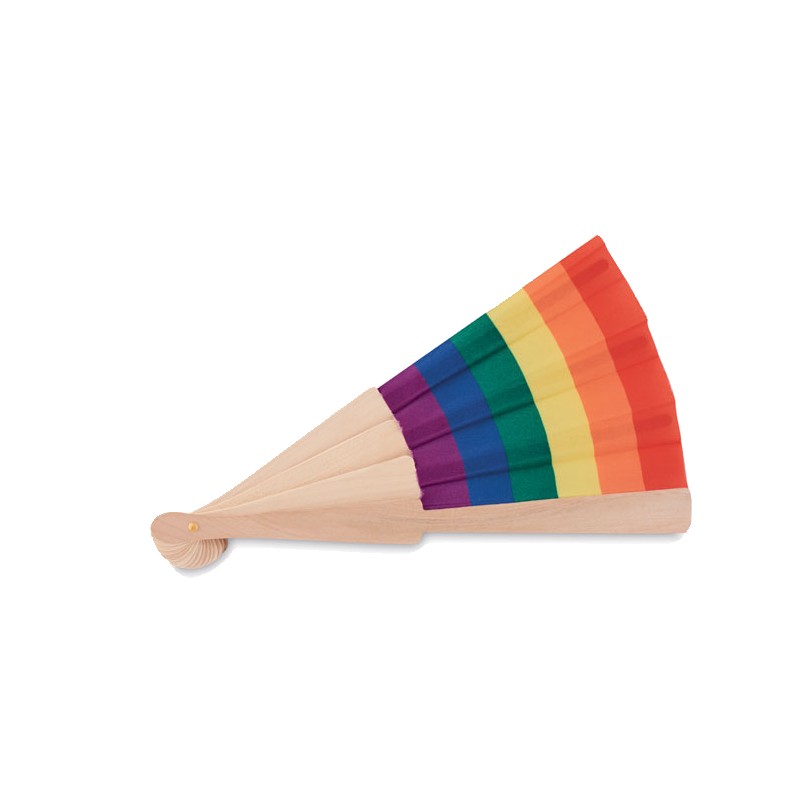 Eventail en bois et tissu polyester avec motif arc-en-ciel.