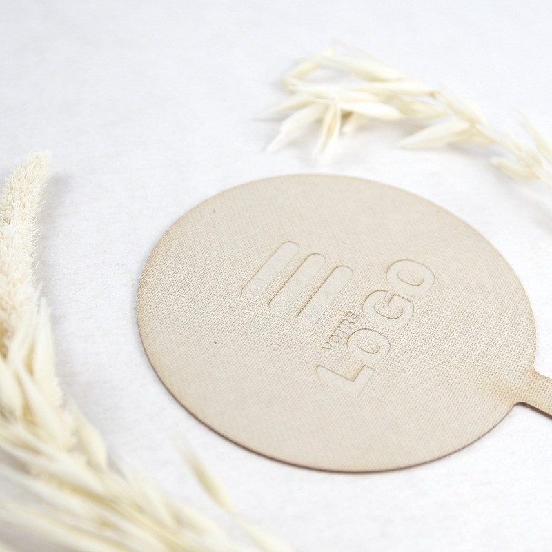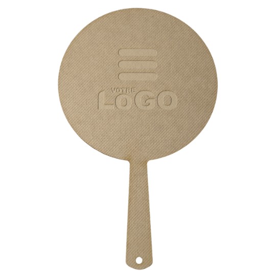 Découvrez notre éventail rond en fibre de cellulose, un accessoire compact et élégant mesurant 15 x 10 cm. Personnalisez-le par gravure pour offrir un cadeau unique. Possibilité de conception sur mesure (forme, bois, gravure).