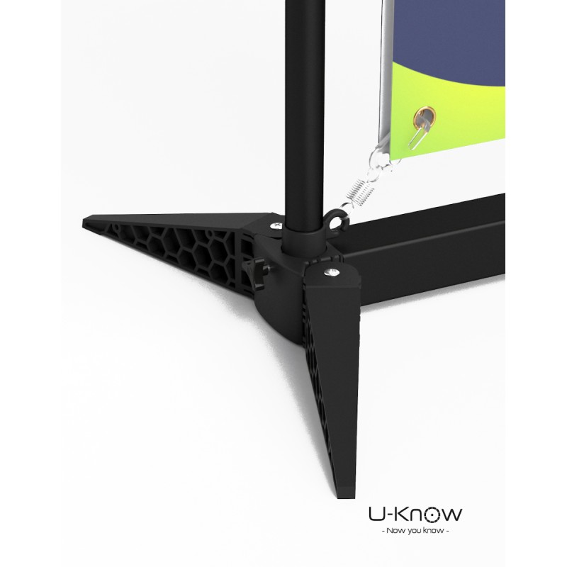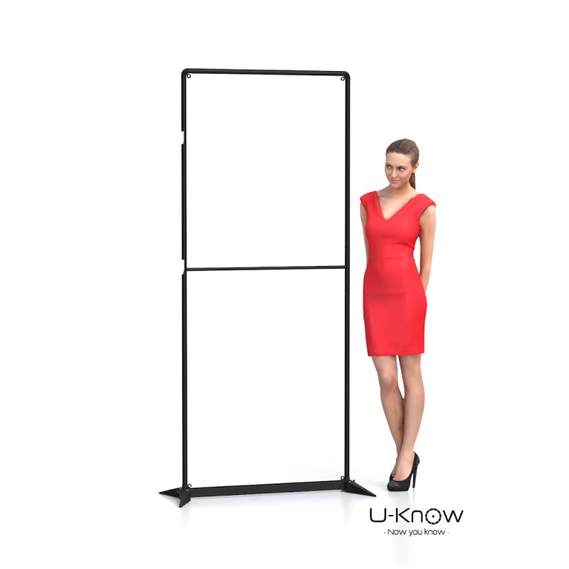 Les deux options sont disponibles en impression recto seul ou recto/verso. La housse imprimée en France recouvre la structure en aluminium. Quant à l’affiche en bâche, elle se fixe grâce aux œillets aux quatre coins et laisse apparaitre la structure noire.