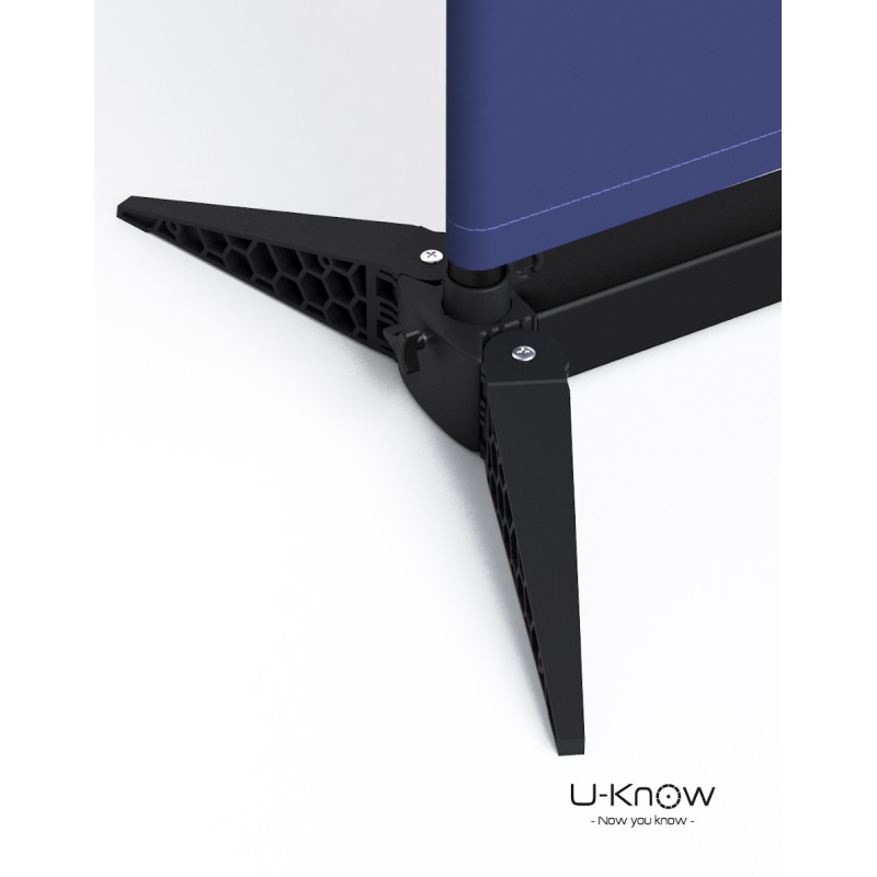 Son avantage principal réside dans la possibilité d’habiller la structure de 2 façons différentes : la 1ère est une housse (ou chaussette) norme anti-feu B1 imprimée en sublimation numérique, la 2ème est une affiche imprimée sur une bâche anti-feu norme B1 avec œillets.