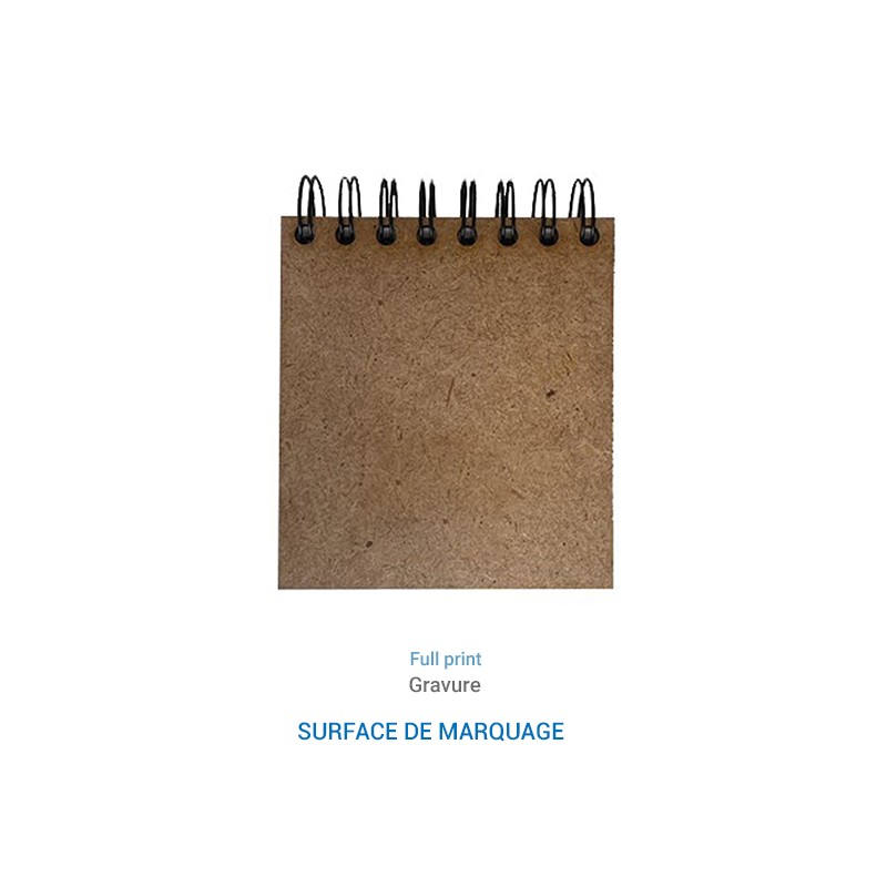 Certifié Origine France Garantie. Fabrication française et personnalisation dans notre atelier parisien.Bloc-notes Made In France en Bois MDF (fibre de bois haute densité) - 96 pages blanches de 80gr/m² - Dimensions: 10,5 x 11 cm - Coloris de spirale au choix : noir, métal brillant, bleu, rouge, blanc - Zone de marquage : Full Print. La couleur du bois peut varier en fonction des arrivages.