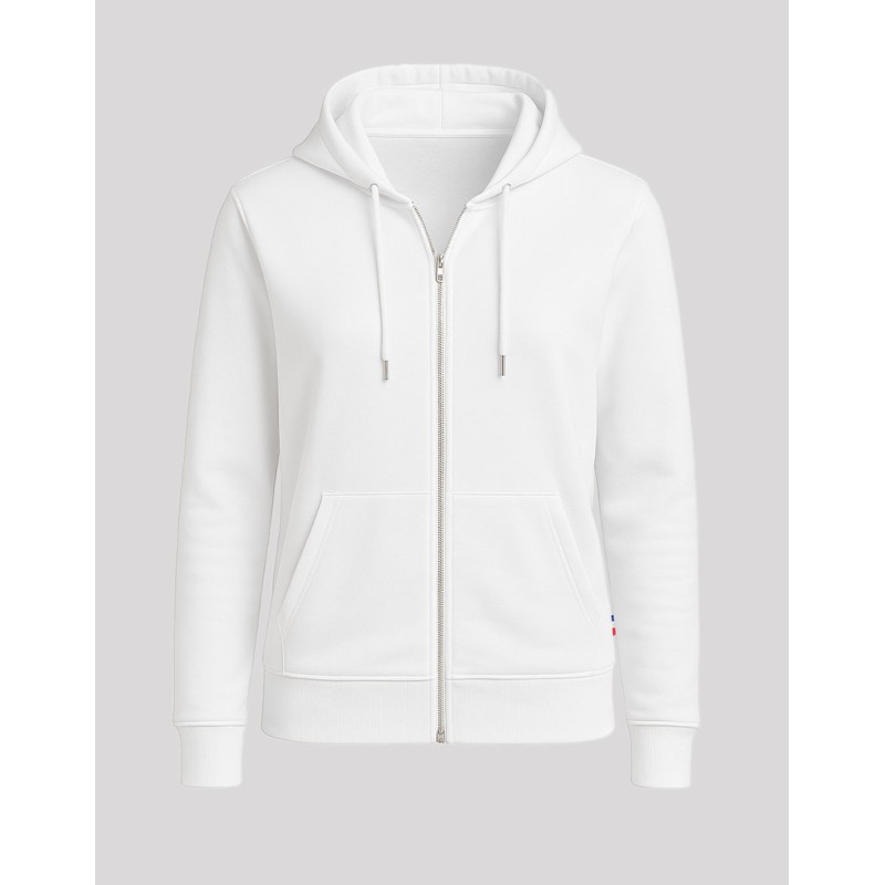 Hoodie zippé unisexe Made in France 80% coton biologique certifié OCS 20% polyester recyclé. Matière Terry 350g/m² lavée, non grattée pour éviter le boulochage + traitement silicone pour améliorer la longévité du vêtement. Capuche doubliée dans la matière. Cordon ton sur ton avec embout métal. Col en demi lune dans la matière extérieure. Zip YKK central. Poches mains passepoilées Bande de propreté au col. Double piqure en bas de corps et de manches. Toucher soyeux.